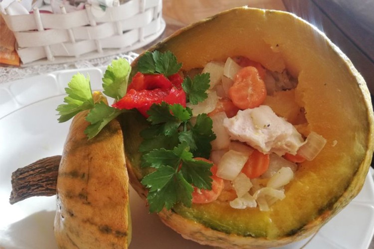 Kao jedan neobičan, ali veoma ukusan obrok za današnji ručak preporučujemo piletinu sa povrćem u bundevi.