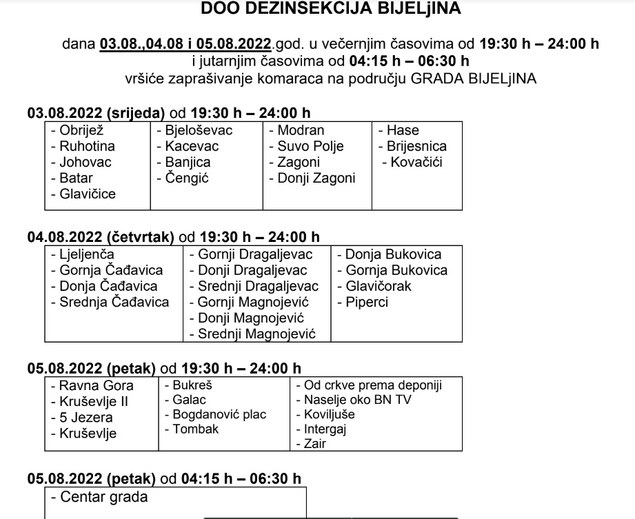 Zaprašivanje komaraca u centru Bijeljine najavljeno je za petak, 5. avgusta, saopšteno je iz preduzeća "Dezinsekcija".
