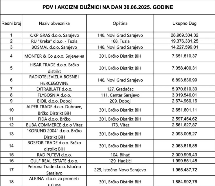 Prema posljednjem spisku PDV i akciznih dužnika, kojeg je aktuelizirala Uprava za indirektno oporezivanje BiH, na prvih 15 pozicija se nalazi čak 10 firmi s privatnim kapitalom. Pozicionirane su od 3. do 13. mjesta i ukupno duguju više od 50 miliona KM državi BiH, preciznije 50.506.612 KM.