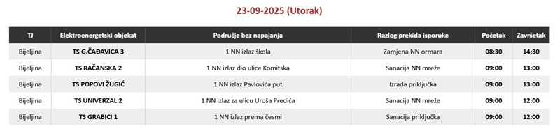 BIJELJINA – Zbog radova na elektroenergetskoj mreži više naselja u Bijeljini u utorak, 23. septembra, biće privremeno bez napajanja električnom energijom, saopšteno je iz bijeljinske Elektrodistrubucije.
