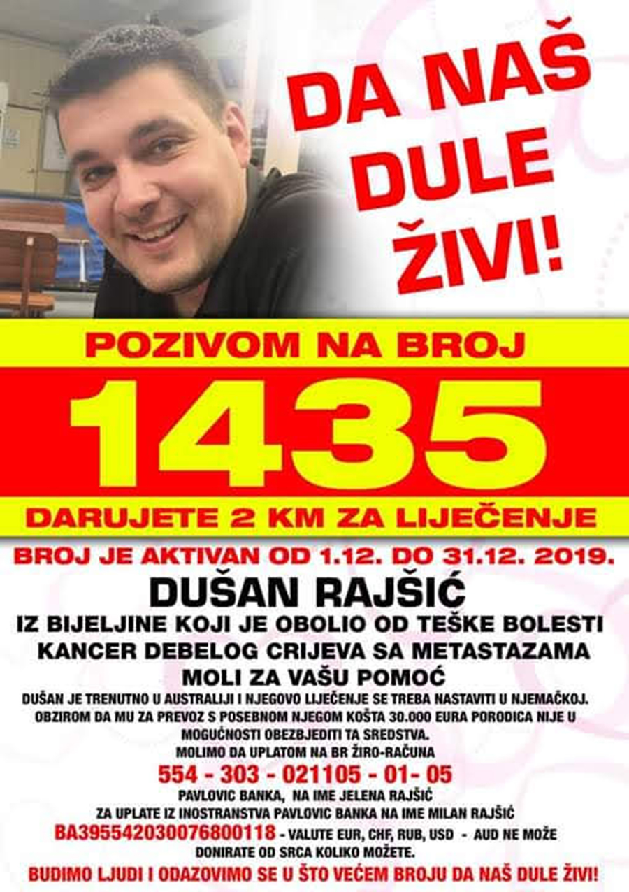 Dušanu Rajšiću (35) iz Bijeljine, trenutno nastanjenom u Pertu u Australiji, potrebna je pomoć u liječenju karcinoma debelog crijeva.