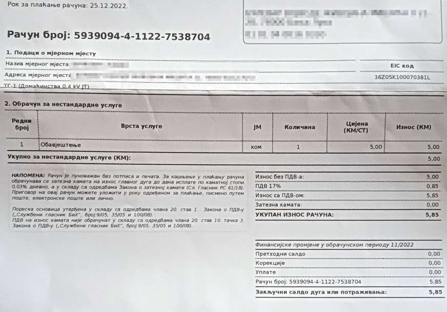 U najmanju ruku sam bio šokiran kad sam otvorio kovertu koju sam dobio od „Elektroprivrede RS“. U njoj je bio račun od 5,85 KM za nestandardnu uslugu.