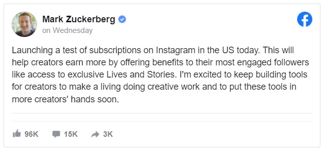 "Danas pokrećemo testno uvođenje pretplate na Instagramu u SAD-u. To će pomoći kreatorima sadržaja da zarade više, nudeći dodatne pogodnosti svojim najangažiranijim pratiteljima, kao što je pristup ekskluzivnim liveovima i Storyjima. Uzbuđen sam što ću nastaviti stvarati alate za kreatore sadržaja kako bi zarađivali za život kreativnim radom i što će te alate uskoro dobiti još veći broj kreatora sadržaja", napisao je.