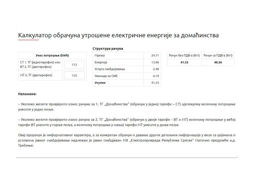 Kada se ovi kilovati stave u kalkulator po novom obračunu, januarski račun bi bio nešto manji, odnosno 48,36 KM (41,33 KM bez PDV). Od toga se na mrežarinu odnosi 24,71 KM, na električnu energiju 13,96 KM, naknada za OIE 0,19 KM i 2,48 za uslugu snabdijevanja.