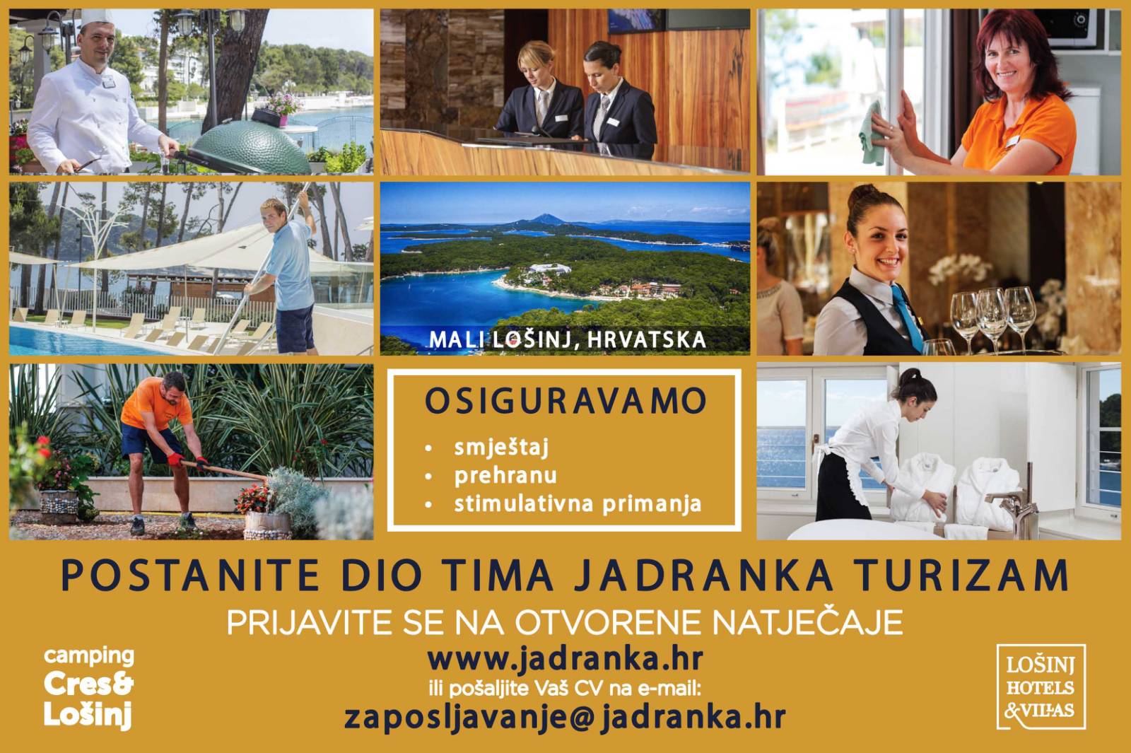 "Prijavite se na otvorene konkurse koje možete pronaći na našoj internet stranici www.jadranka.hr ili pošaljite svoj CV na mejl [email protected]. Takođe svim zainteresovanim naglašavamo da osiguravamo smještaj, hranu te stimulativna primanja", poručuju iz Jadranka turizam.