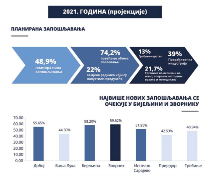 Zavod za zapošljavanje Republike Srpske je objavio informacije o kretanjima na tržištu rada i potrebama zapošljavanja u 2021. godini. Prvi put nakon jedanaest godina ovakvo istraživanje je sprovedeno u Republici Srpskoj a u periodu od oktobra do decembra 2020. anketirano je 978 poslodavaca. Trend pokazuje da će u 2021. polovina od ispitanih poslodavaca zapošljavati zbog planiranog povećanja poslovanja.
