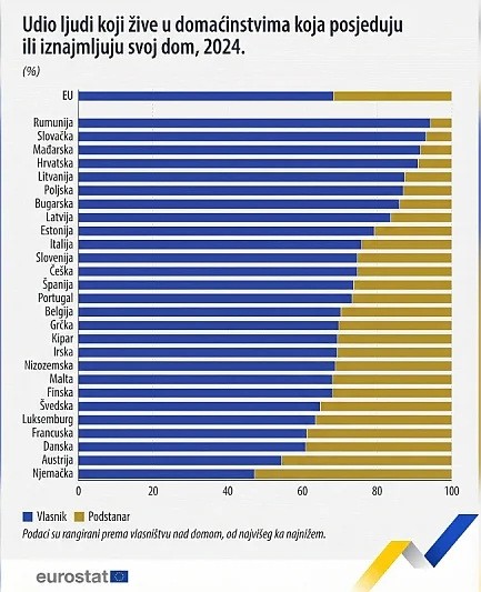 Prema podacima za 2024. godinu, 68 posto stanovništva u EU živi u vlastitom domu, dok preostalih 32 posto iznajmljuje stambeni prostor. Međutim, prosjek skriva velike varijacije.