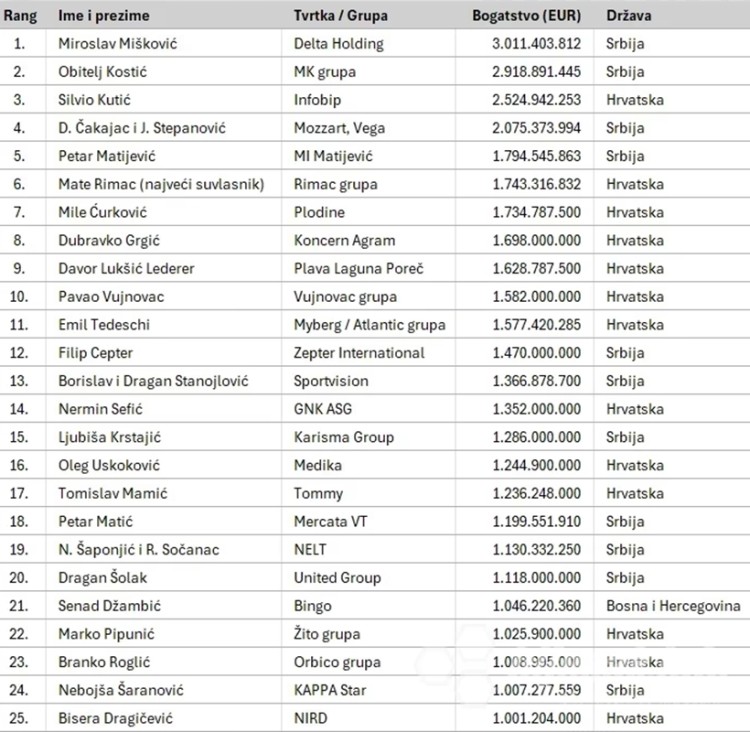 Na listi, očekivano, dominiraju srpski i hrvatski biznismeni, među kojima se po prvi put smjestio i neko iz BiH. Naime, na 21. mjestu nalazi se Senad Džambić, vlasnik Bingo grupacije, koji je prema podacima sa liste “težak” 1.046.220.360 evra.