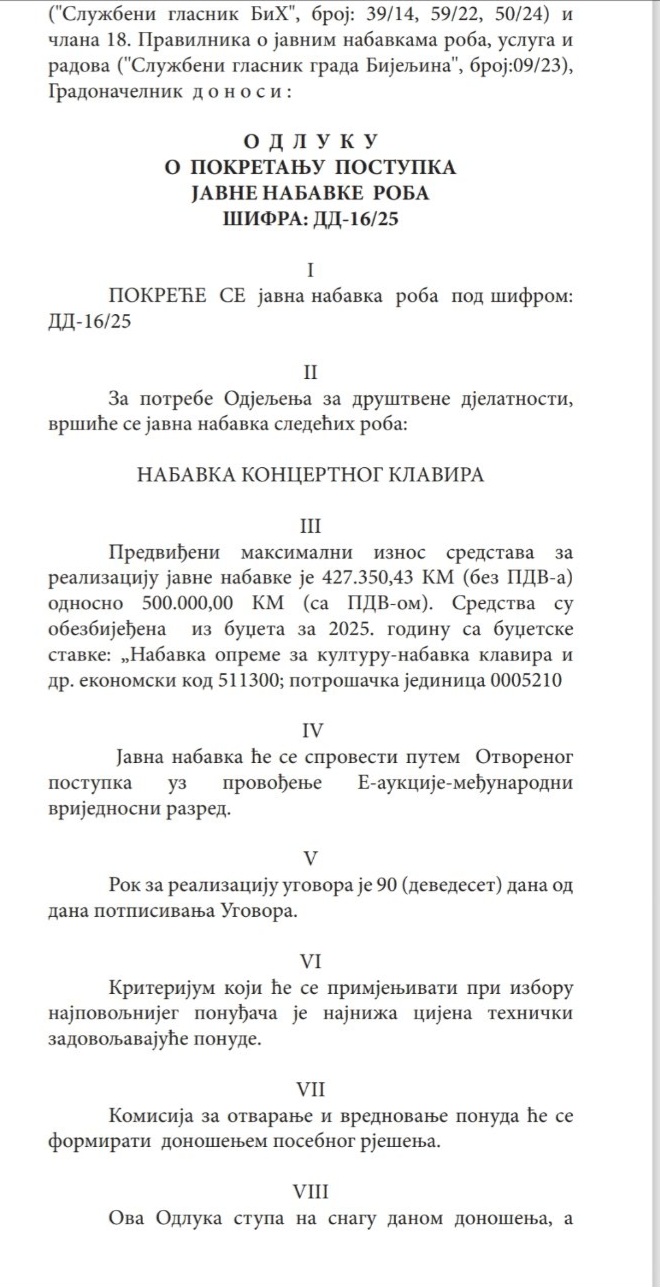 Gradonačelnik Bijeljine Ljubiša Petrović donio je Odluku o pokretanju postupka javne nabavke klavira, vrijednosti do 500.000 maraka sa PDV-om, saznaje InfoBijeljina.
