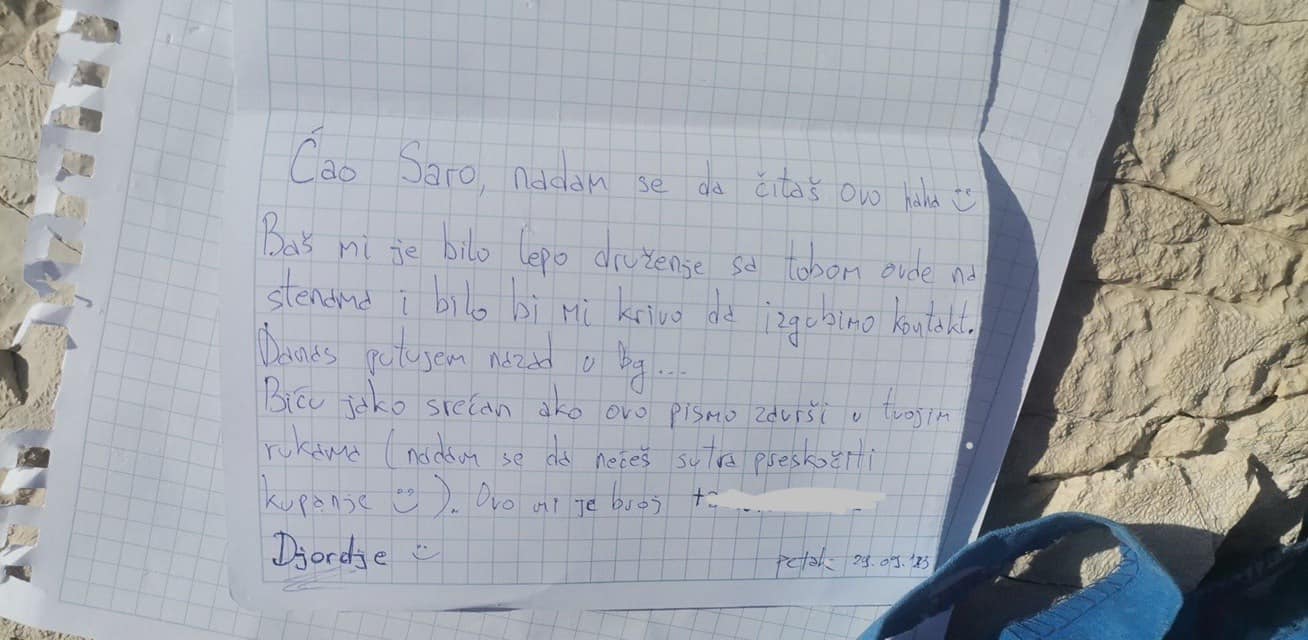 "Ćao, Sara. Nadam se da čitaš ovo. :) Haha Baš mi je bilo lepo druženje sa tobom ovde na stenama i bilo bi mi krivo da izgubimo kontakt. Danas putujem nazad za Bg... Biću jako srećan ako ovo pismo završi u tvojim rukama (nadam se da nećeš sutra preskočiti kupanje). Ovo mi je broj...", napisao je Đorđe.