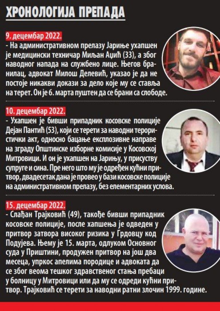 Uoči nove runde dijaloga u Briselu, zakazane za 4. april, Priština koristi stare trikove: podiže tenzije i zastrašuje naše sunarodnike na Kosovu i Metohiji. U tu svrhu ponovo su aktivirane i optužnice na osnovu kojih love Srbe, prije svega bivše policajce koji su u novembru prošle godine vratili uniforme kosovske policije, protestujući tako zbog terora koji trpi naš narod u Pokrajini.