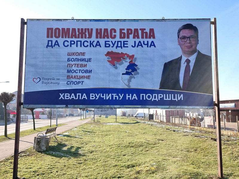 Pored velike fotografije predsjednika Republike Srbije Aleksandra Vučića pobrojani su samo neki od projekata koji su njegovim zalaganjem i zalaganjem Vlade Srbije i drugih srpskih institucija, realizovani ili najavljeni za realizaciju u Republici Srpskoj: škole, bolnice, putevi, mostovi, vakcine, pomoć razvoju sporta.