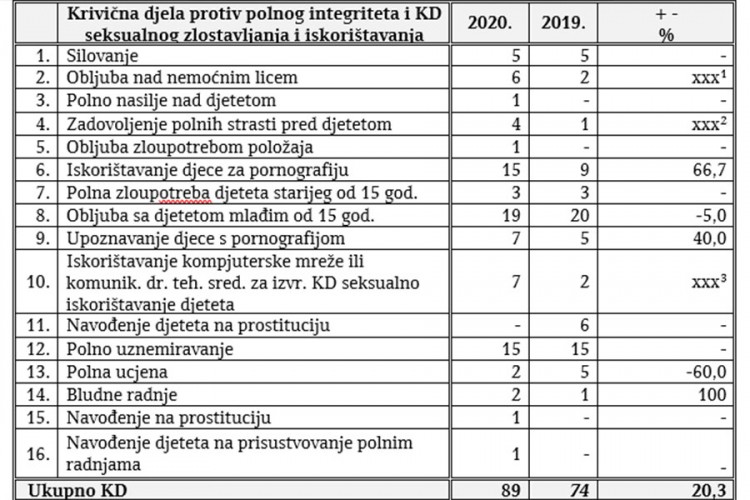 Kako se navodi u njihovom izvještaju za prošlu godinu, radi se o pet silovanja, od kojih je jedno bilo u pokušaju, te 19 krivičnih djela obljuba sa djetetom mlađim od 15 godina, 15 iskorištavanja djece za pornografiju, 15 polnih uznemiravanja i sedam krivičnih djela upoznavanje djece sa pornografijom i sedam krivičnih djela iskorištavanje kompjuterske mreže za izvršenje krivičnog djela seksualnog zlostavljanja i iskorištavanja djeteta.