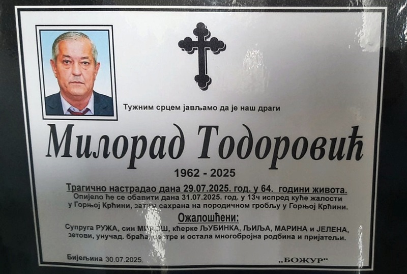 Milorad Todorović (63) zvani Monta iz Krćine, dugogodišnji radnik MUP-a Srpske, inače vozač načelnika Policijske uprave Bijeljina, biće sahranjen sutra, u četvrtak.