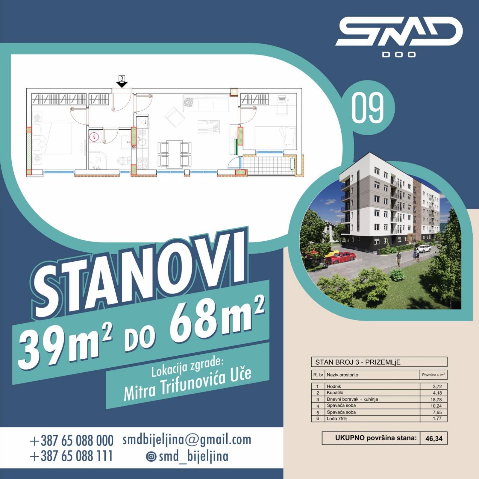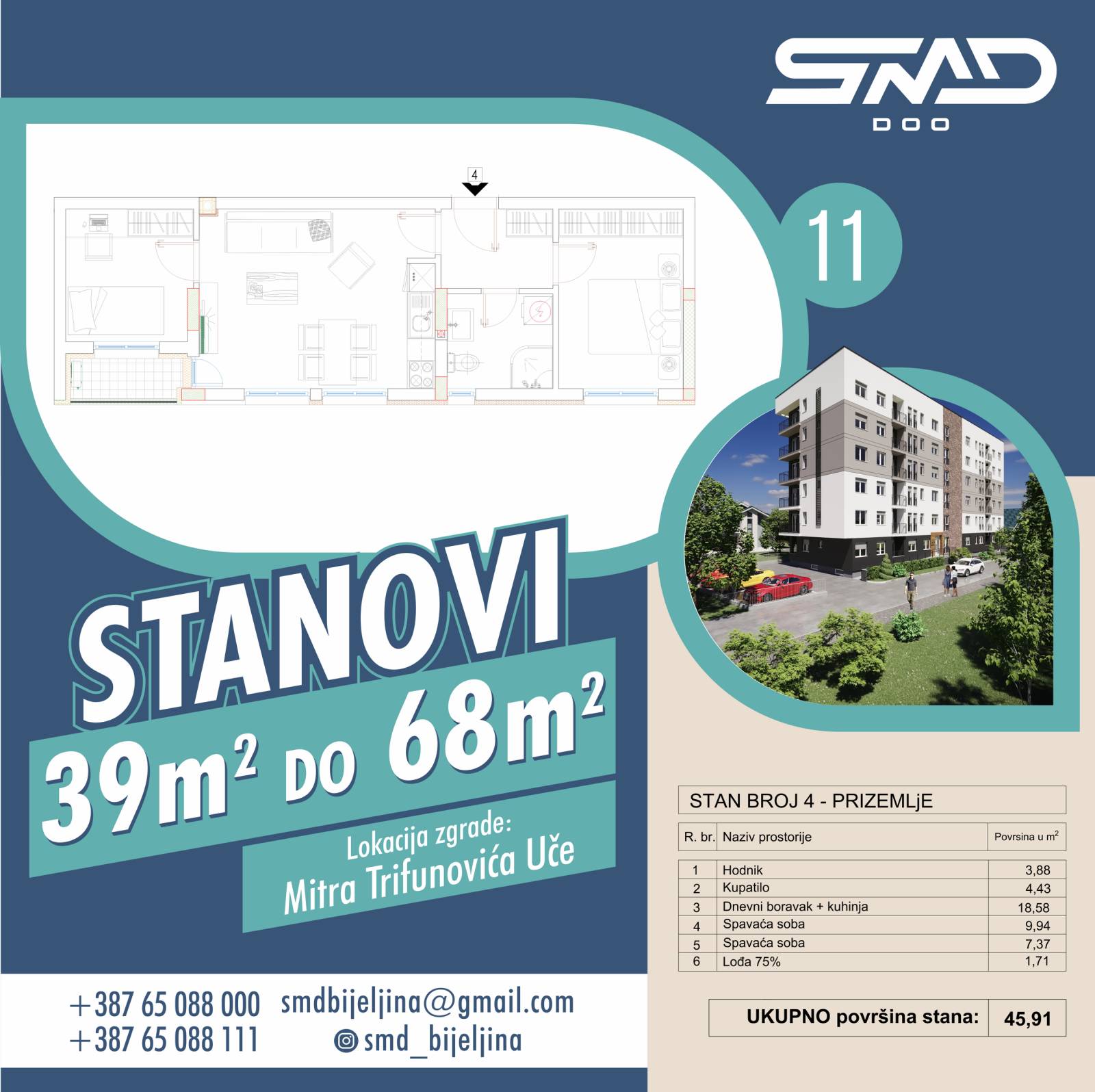 Akcijom su obuhvaćeni i stanovi u prizemlju: broj tri, površine 46,34, te broj četiri, površine 45,91 metar kvadratni.