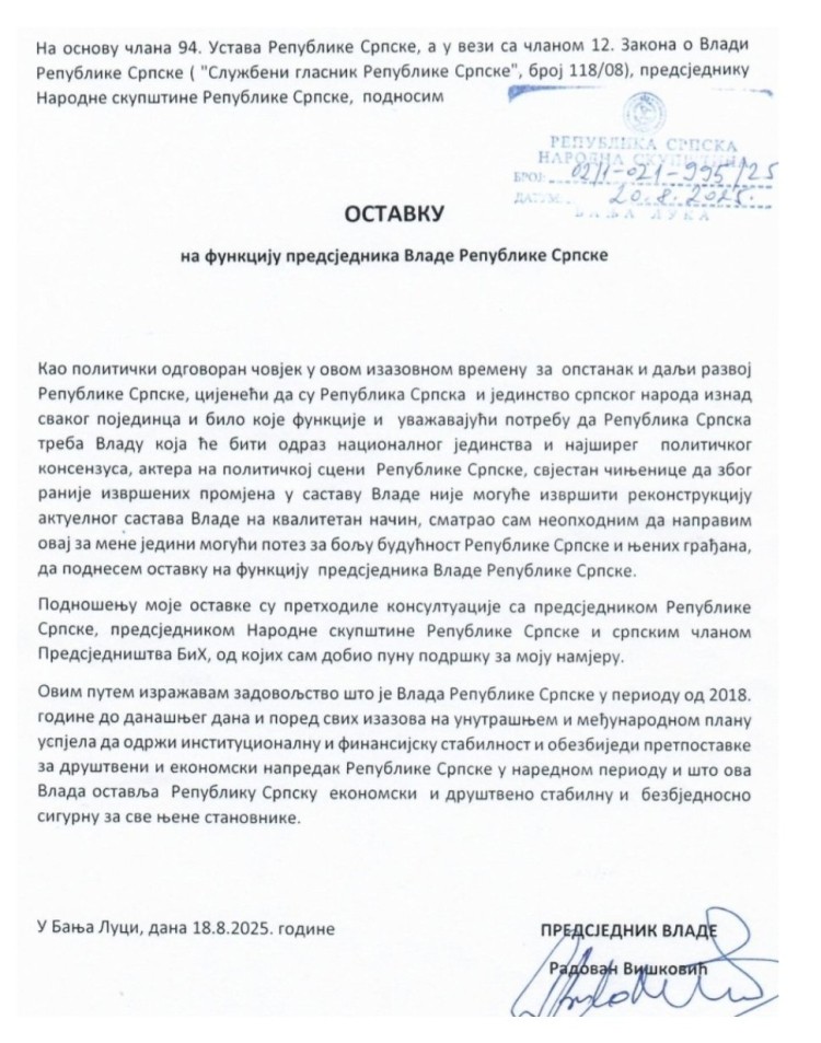 U ostavci koja je dostavljena Narodnoj skupštini RS i koju će Višković sutra detaljnije obrazložiti pred narodnim poslanicima, on je, između ostalog naveo: