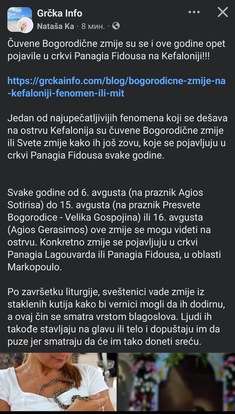 - Čuvene Bogorodičine zmije su se i ove godine opet pojavile u crkvi Panagia Fidousa na Kefaloniji! Jedan od najupečatljivijih fenomena koji se dešava na ostrvu Kefalonija su čuvene Bogorodičine zmije ili Svete zmije kako ih još zovu koje se pojavljuju u crkvi Panagia Fidousa svake godine. Svake godine od 6. avgusta na praznik Agios Sotirisa do 15. agvusta na praznik Presvete Bogorodice - Velika Gospojina ili 16. avgusta Agios Gerasimos ove zmije se mogu vidjeti na ostrvu - navodi se u objavi i dodaje: