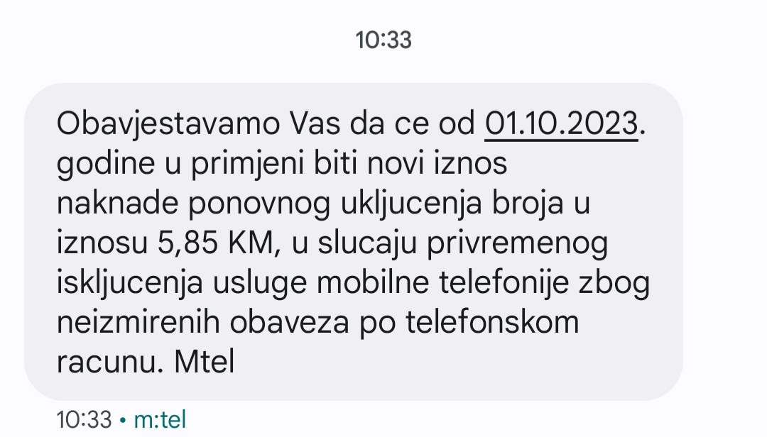 Obavještavamo Vas da će od 01.10.2023. godine u primjeni biti novi iznos naknade ponovnog uključenja broja u iznosu od 5,85 KM, saopštila js kompanija Mtel u SMS porukama koje od jutros šalje svojim pretplatnicima mobilne telefonije.