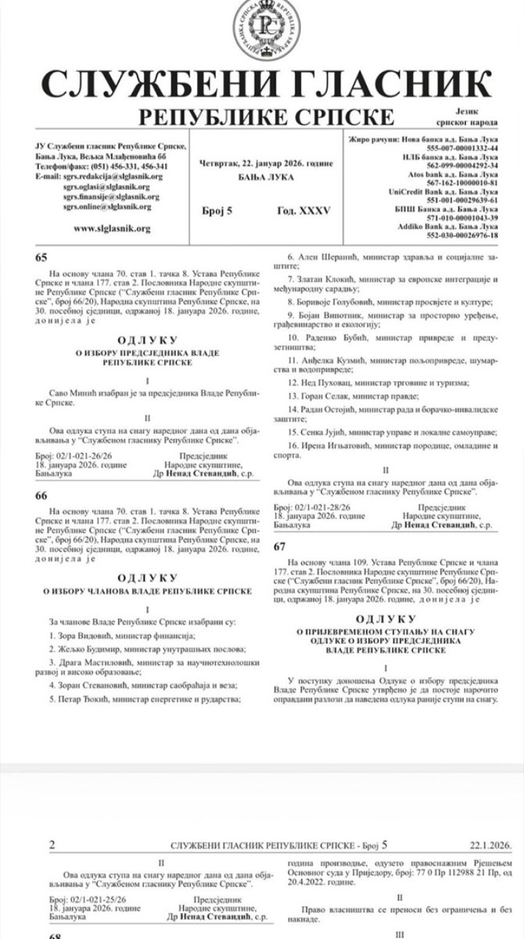 Vlada Republike Srpske, na čelu sa Savom Minićem, koju je Narodna skupština RS izabrala 18. januara 2026. godine, zvanično sutra, 23. januara, može početi sa radom, jer je odluka o njenom izboru objavljena danas, 22. januara, u Službenom glasniku RS.