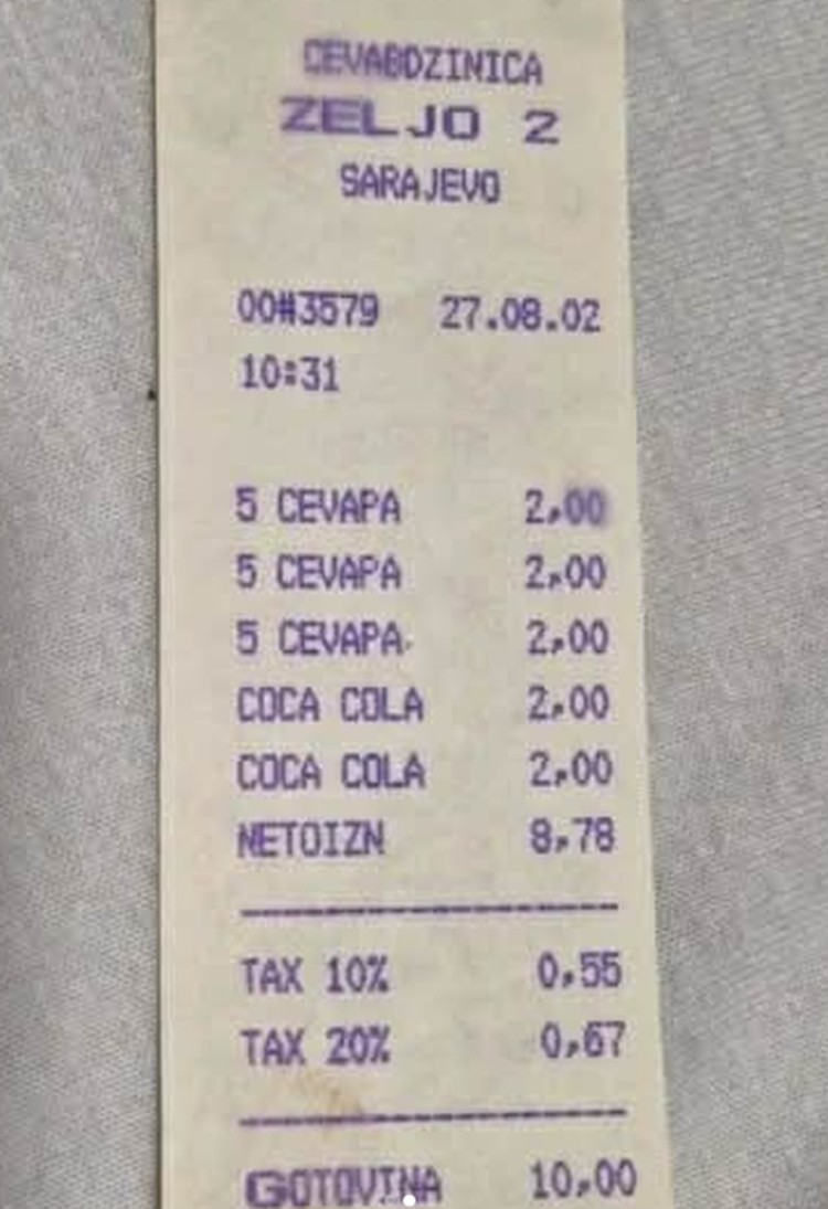 Na računu iz Ćevabdžinice Željo, koji je iznosio 10 maraka, moglo se kupiti tri porcije ćevapa i dvije Coca-Cole, objavio je Večernji.ba.