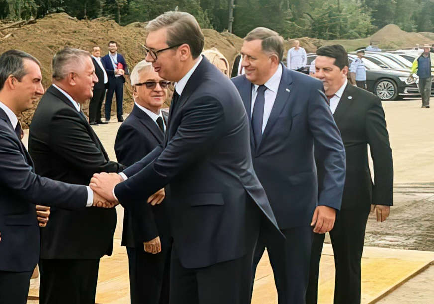 Предсједника Србије @avucic данас у Бијељини су дочекали предсједник Уједињене Српске @nenad_stevandic и српски члан Предсједништва БиХ @MiloradDodik pic.twitter.com/jG01qR1W5v