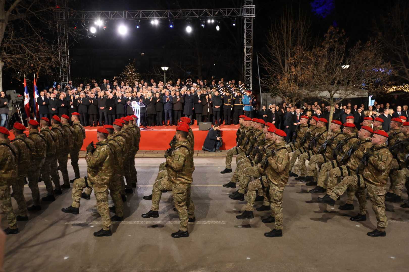 Zastavni vod Počasne jedinice predvodio je komandir Vitomir Petričević, koji je uz pozdrav oficirskom sabljom izvršio predaju raporta premijeru Viškoviću.
