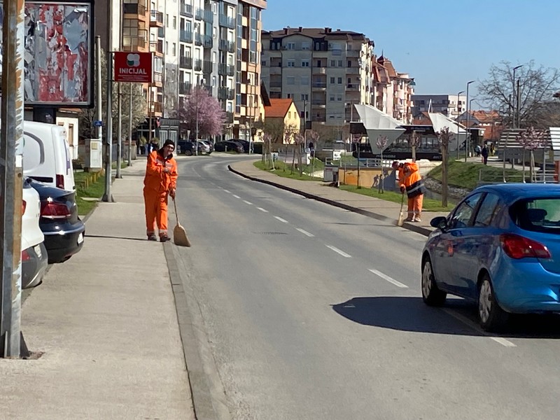 Ekipe u narandžastim i zelenim uniformama vrijedno rade na čišćenju trotoara, travnatih površina i okolnih staza, kako bi ovaj dio grada bio uredan i prijatan za šetnju.