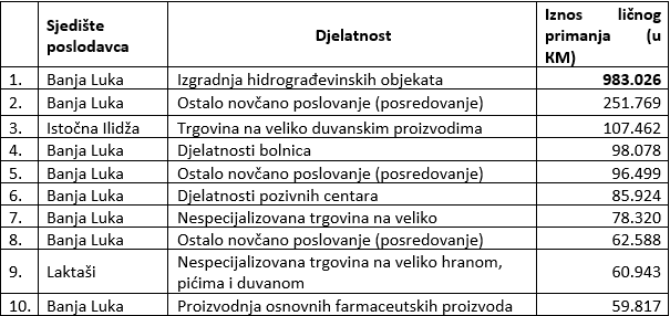 Listu zatvaraju radnik zaposlen u Laktašima u oblasti nespecijalizovana trgovina na veliko hranom, pićima i duvanom sa 60.943 KM i u Banjaluci u firmi koja se bavi proizvodnjom osnovnih farmaceutskih proizvoda koji je zaradio 59.817 KM.