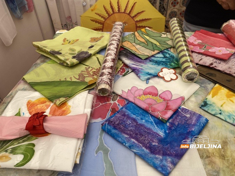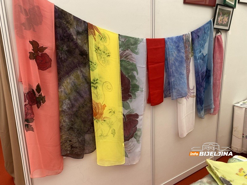 - Slikam non stop. Često slikam mrtvu prirodu, cvijetne motive i apstrakciju. Radim na kineskoj svili, tehnikama akvarel i batik - oslikavanje svile metodom razlivanja boja ili određene površine svile prekrivam voskom da bi zadržale osnovnu boju. Svi moji radovi su unikatni jer su rađeni ručno. Slike se manje traže u odnosu na ešarpe. Svaka dama želi da ima lijepu maramu kao modni detalj. Kćerka ih prodaje putem interneta u Novom Sadu, ja ovdje, tako da sam spojila korisno i lijepo. Ispunjavam svoje slobodno vrijeme radeći ono što volim, a dopunim i kućni budžet - priča Rada za portal InfoBijeljina.