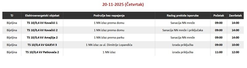 Iz „Elektro-Bijeljine“ obavještavaju potrošače da će u četvrtak, 20. novembra, zbog planiranih radova na mreži doći do privremenih prekida u isporuci električne energije na pojedinim lokacijama.