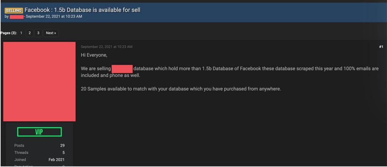 Krajem septembra korisnik poznatog hakerskog foruma objavio je kako posjeduje lične podatke više od 1,5 milijardi korisnika Facebooka. Podaci su trenutno u prodaji na odgovarajućoj platformi foruma, a potencijalni kupci imaju priliku “nabaviti” podatke odjednom ili u manjim količinama.