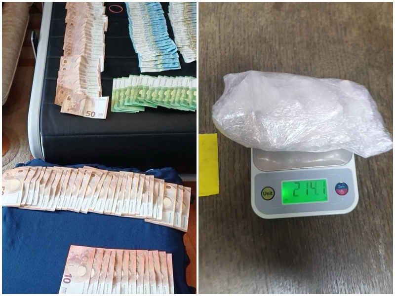 Dodaju da je prilikom pretresa pronađeno i oduzeto oko 215 grama opojne droge kokain i 6.850 evra i mobilni telefon, a navedeno lice je lišeno slobode.