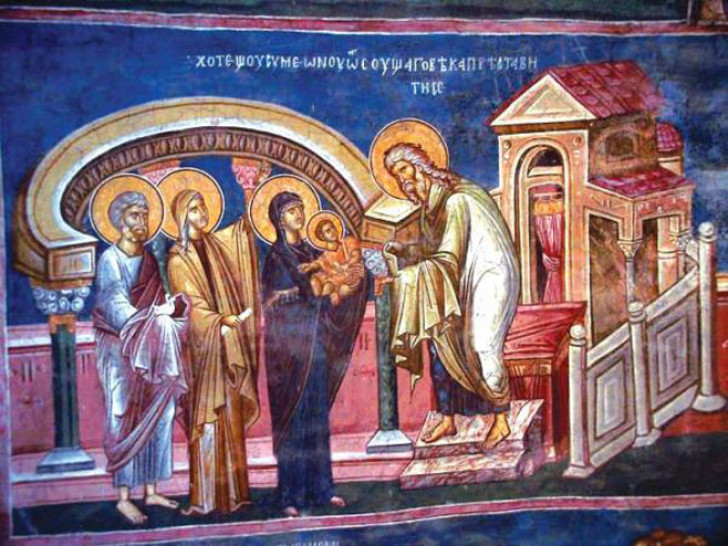 U hramu su Bogorodicu i Hrista dočekali starac Simeon Bogoprimac i proročica Ana. Vođen Božjom promišlju, Simeon je u djetetu prepoznao Spasitelja i izgovorio riječi koje su postale dio hrišćanske molitve i liturgije:
