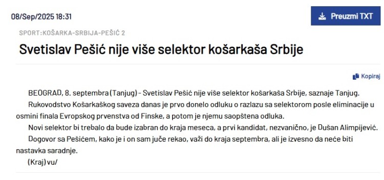 Međutim, sada se oglasio Košarkaški savez Srbije koji tvrdi da vijest koju je pustio Tanjug nije istinita.