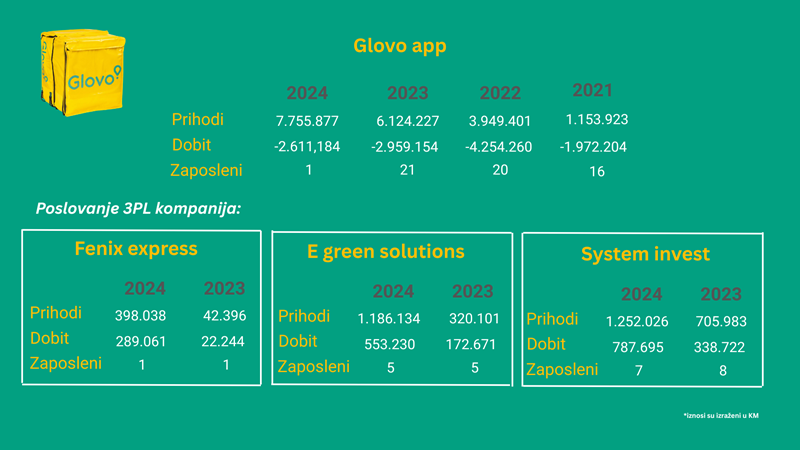 Zanimljivo je da sve tri posluju pozitivno, dok je „Glovo“ od dolaska u BiH u ogromnom minusu koji zaključno sa prošlom godinom iznosi skoro 12 miliona maraka.