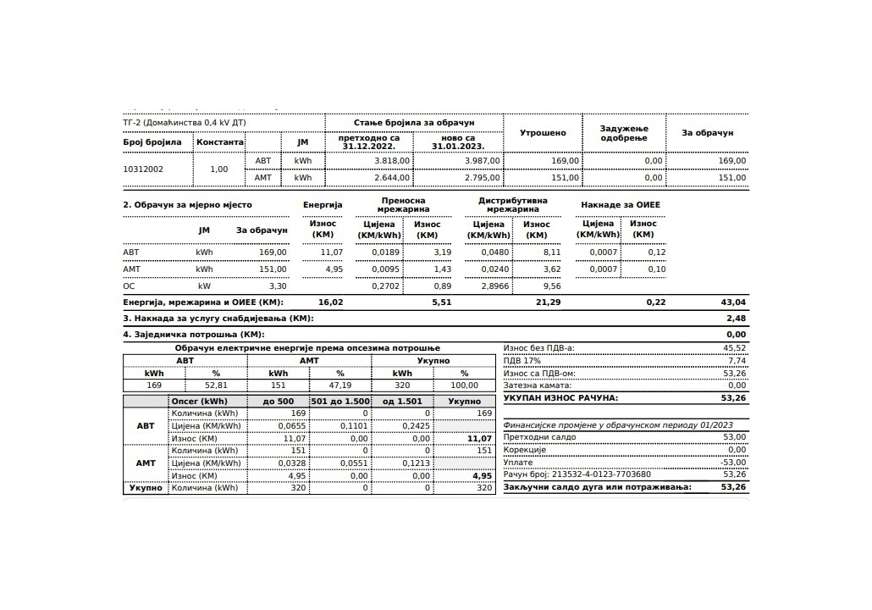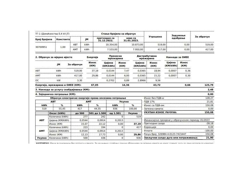 Za potrošenih 936 kilovata sama električna energija je obračunata po cijeni od 67,05 KM, dok je ukupna mrežarina 58,08 KM. Ukupan iznos računa za ovu potrošnju iznosi 150,08 KM. Da je obračunato u decembru, račun bi bio 151,17 KM.