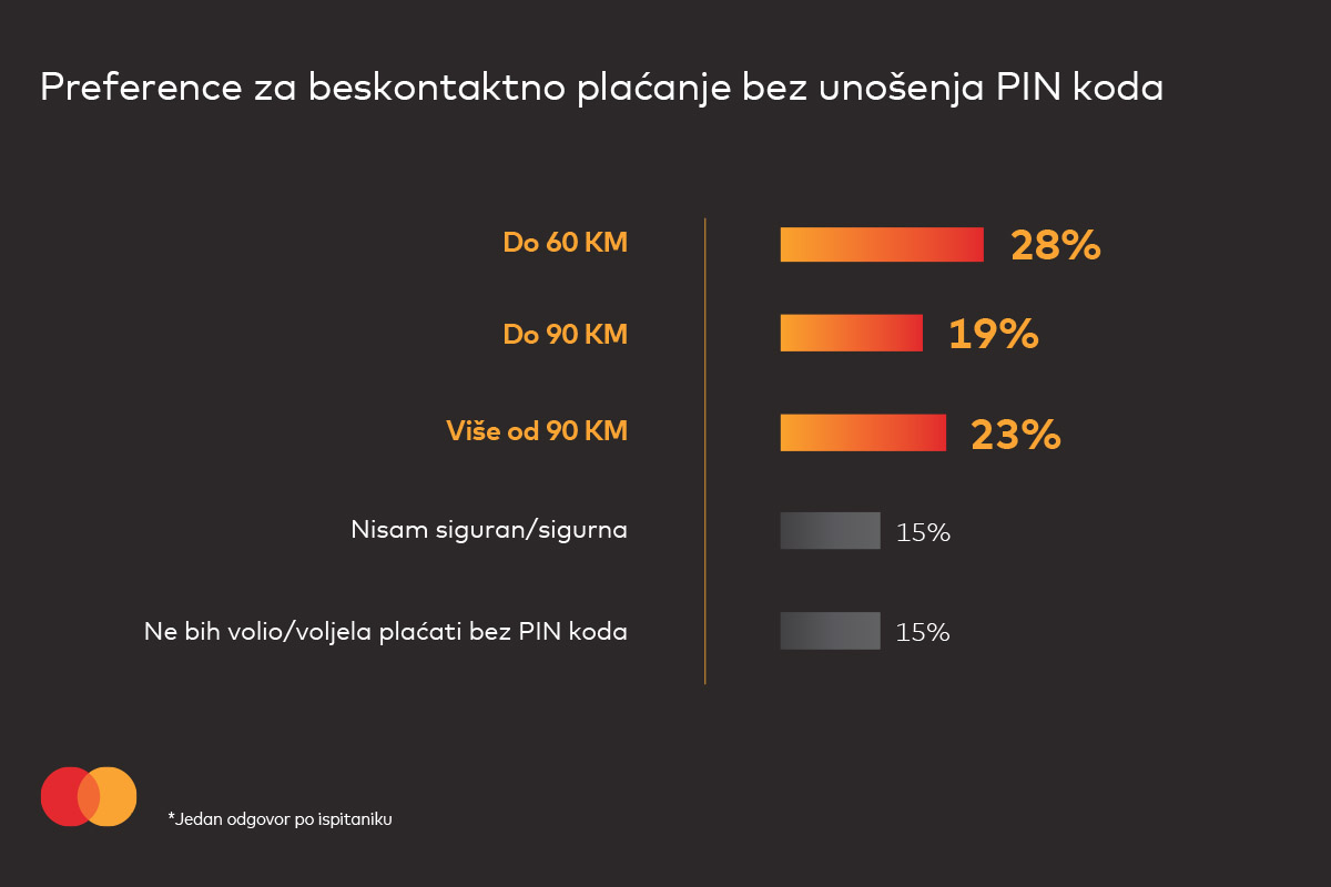 Iznos od 60 KM je trenutna granica do koje nije potrebno unositi PIN kod prilikom beskontaktnih plaćanja Mastercard karticama i za 28% ispitanika, taj limit je odgovarajući. Međutim, 19% ispitanika je izrazilo spremnost da plaća beskontaktno bez unosa PIN koda iznose do 90 KM, dok bi još 23% bilo spremno da tako plaća i iznad 90 KM.
