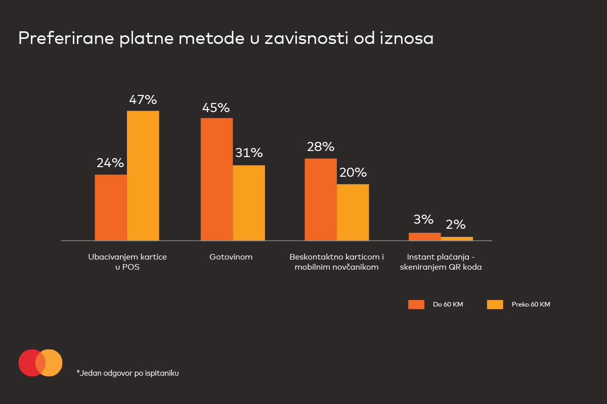 Još jedan pokazatelj oslanjanja na beskontaktna plaćanja je i MasterIndex podatak da se 28% ispitanika odlučuje da iznose do 60 KM plati prislanjanjem kartice ili telefona, što je malo više nego broj korisnika koji te iznose plaćaju standardnim ubacivanjem kartice u POS terminal (24%).