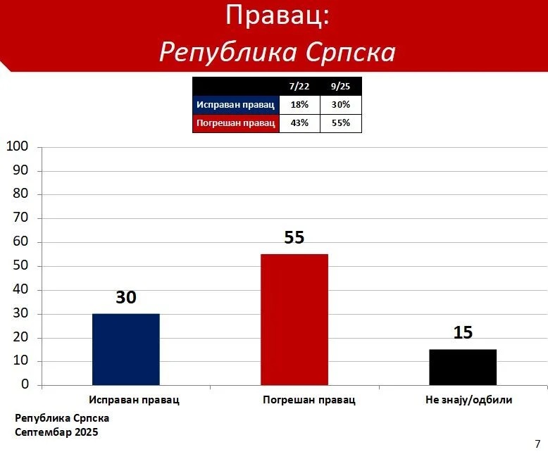 Više od polovine (55 posto) ispitanika smatra da je Republika Srpska krenula pogrešnim putem, u poređenju s 30 posto njih koji smatraju da stvari idu u dobrom pravcu. Pored toga, 70 posto kaže da je situacija u Bosni i Hercegovini krenula pogrešnim putem, dok 11 posto smatra da stvari idu u dobrom pravcu.
