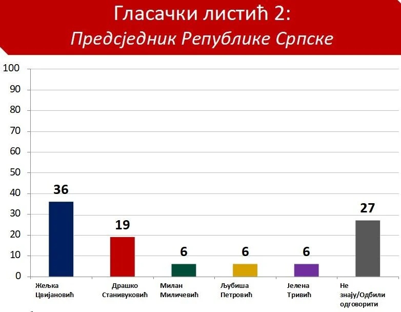 Među potencijalnim kandidatima ove stranke čija uspješnost je ispitivana protiv Draška Stanivukovića, Ljubiše Petrovića, Milana Milićevića i Jelene Trivić na pojedinačnim glasačkim listićima, Željka Cvijanović osvaja najveći dio glasova sa 36 posto, slijedi Siniša Karan sa 27 posto i Igor Dodik sa 25 posto.