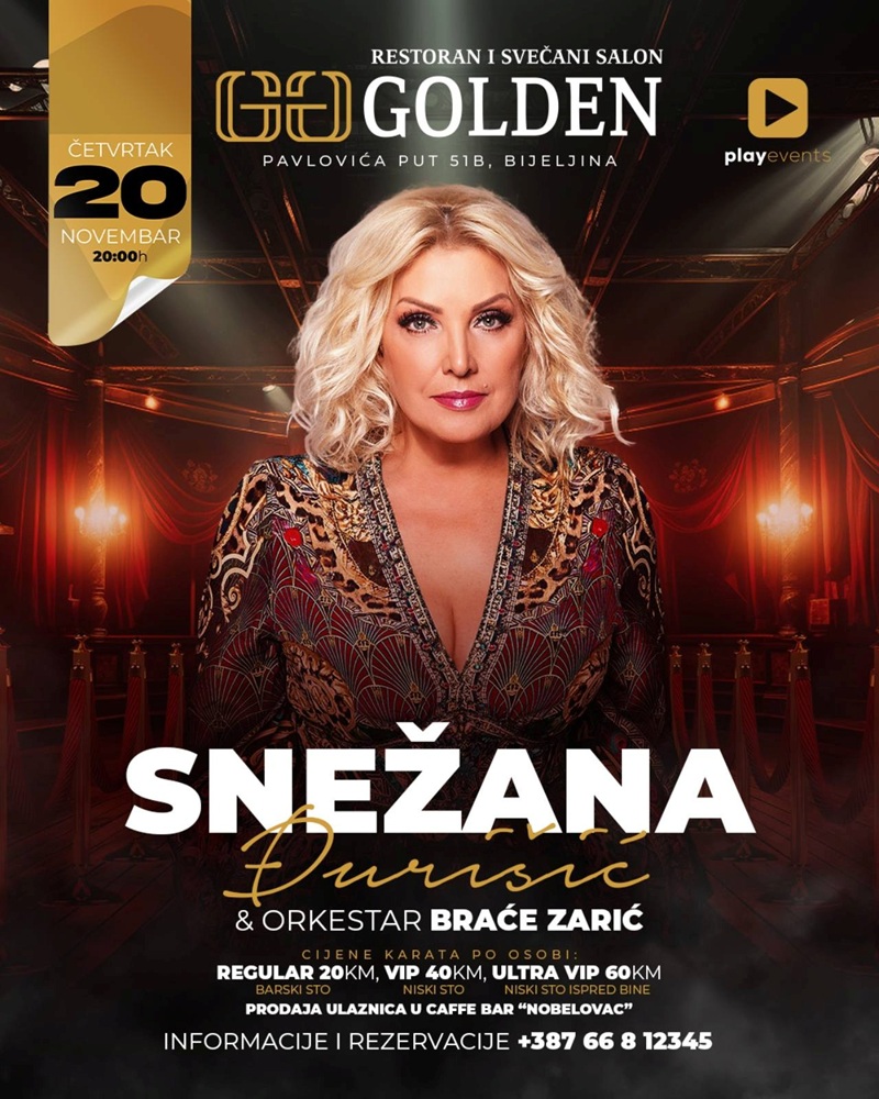 Koncert će biti održan u četvrtak, 20. novembra, u prelijepom i luksuznom ambijentu novootvorenog svečanog salona “Golden” u Bijeljini.