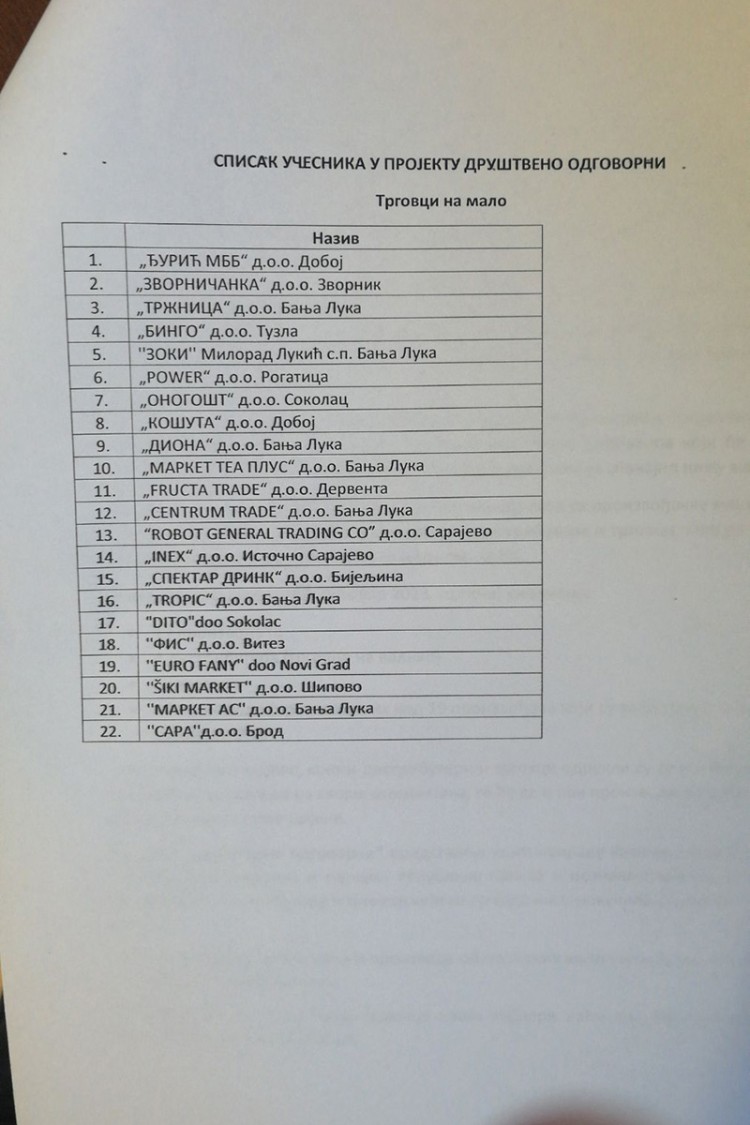 Pored toga, u akciju su se uključila i četiri distributera, odnosno trgovca na veliko, a radi se o "Veneri" iz Banjaluke, "Dukatu" oz Laktaša, "Nelt" Istočno Sarajevo i "Gatarić" Derventa.