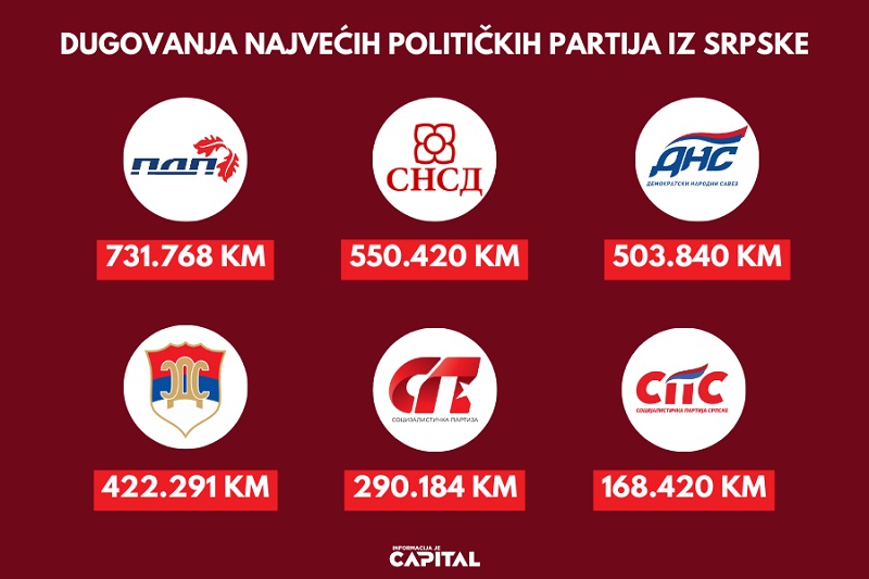 Oglašavanje u medijima, zakup parkiranja, ručkovi u restoranima, smještaj u hotelima, krediti i pozajmice samo su neke od neizmirenih obaveza koje su stranke iz Republike Srpske imale na kraju prošle godine. Neke od najvećih političkih stranaka iz Srpske su lani dugovale gotovo 2,6 miliona KM.