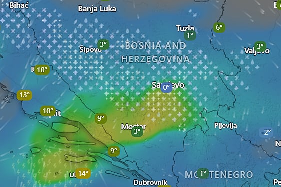 Zahlađenje sa sjevera koje će u Bosni usloviti susnježicu i snijeg očekuje se tokom noći na utorak. Vjetar je umjeren i jak, povremeno sa olujnim udarima, južnog i jugozapadnog smjera.