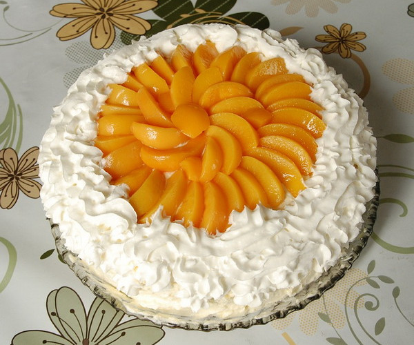 Preko piškota sipajte 1/3 krema, rasporedite lijepo pa na nju poređati u razmacima kriške oljuštenih breskvi.