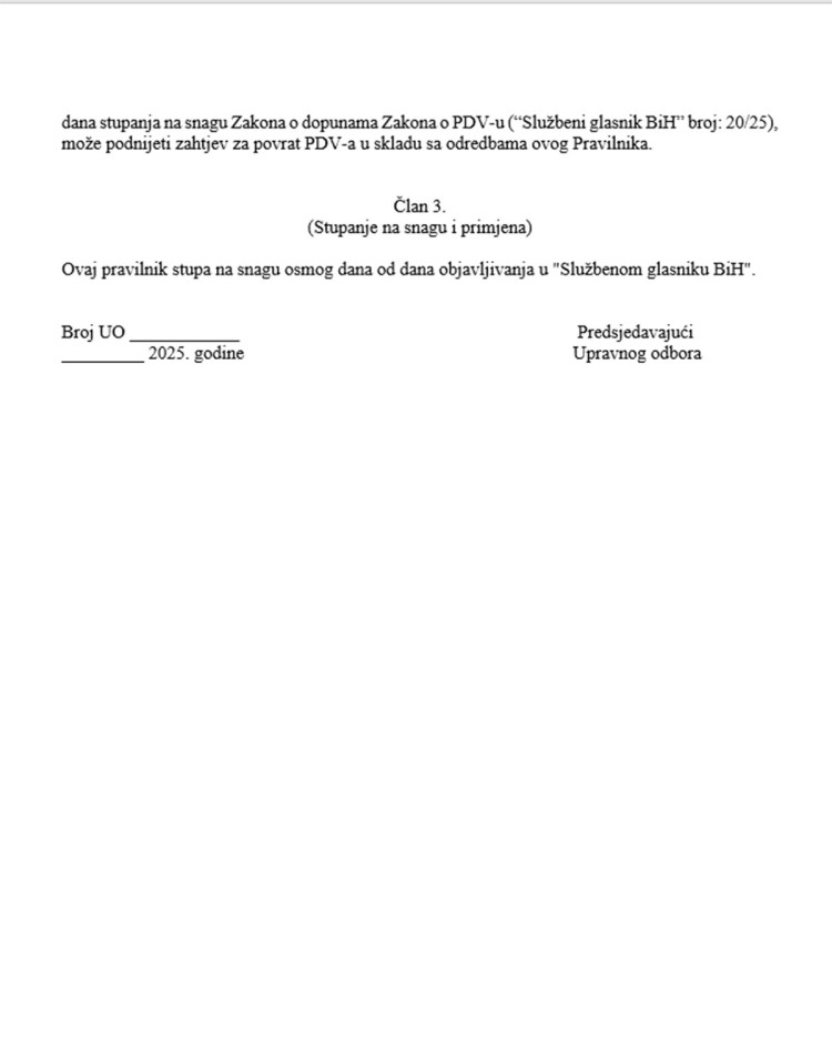 SARAJEVO - Uprava za indirektno oporezivanje (UIO) BiH je danas, 11. septembra, na internet stranici Ekonsultacije objavila Nacrt pravilnika o dopuni Pravilnika o primjeni Zakona o porezu na dodatnu vrijednost (PDV), a kojim su precizirana pravila koja se odnose na povrat PDV-a na prvu kupljenu nekretninu.