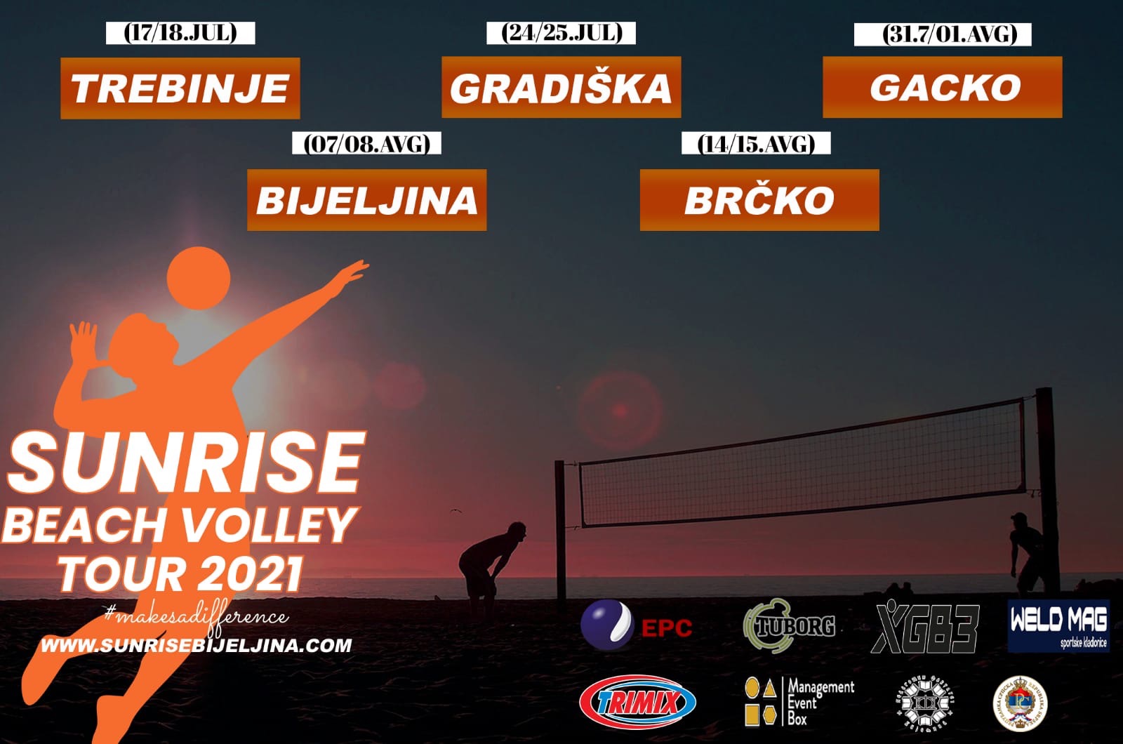 Ovog ljeta će se u Republici Srpskoj održati turniri odbojke na pijesku pod nazivom “Sunrise beach volley tour 2021” i to 17. i 18. jula u Trebinju, 23. i 24. jula u Gradišci, 31. jula i 1. avgusta u Gacku, 7. i 8. avgusta u Bijeljini, a završni turnir u 15. i 16. avgusta u Brčkom.