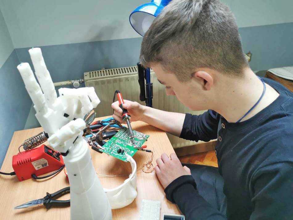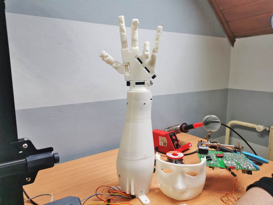 Uroš danonoćno radi na izazovnom zadatku vještačke inteligencije. "Ova humanoidna ruka je samo dio od humanoidnog robota koji je trenutno u izradi. Svakog dana se štampaju dijelovi za projektni zadatak i nadam se da će biti gotov polovinom aprila", objašnjava Uroš.
