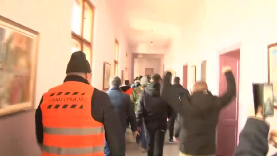 Okupljeni demonstranti su se popeli na sprat i ušli u skupštinsku halu. Oni koji su se tu nalazili, napustili su salu.