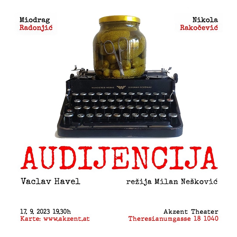 Komad koji je svoju premijeru doživio još 1981. godine u Ateljeu 212, kada su glavne likove igrali Bora Todorović i Petar Kralj, predstavlja politički satirikon iz doba Čehoslovačke i kulta ličnosti. Audijencija iz 1975. prvi je Havelov komad koji oživljavaju Miodrag Radonjić i Nikola Rakočević.